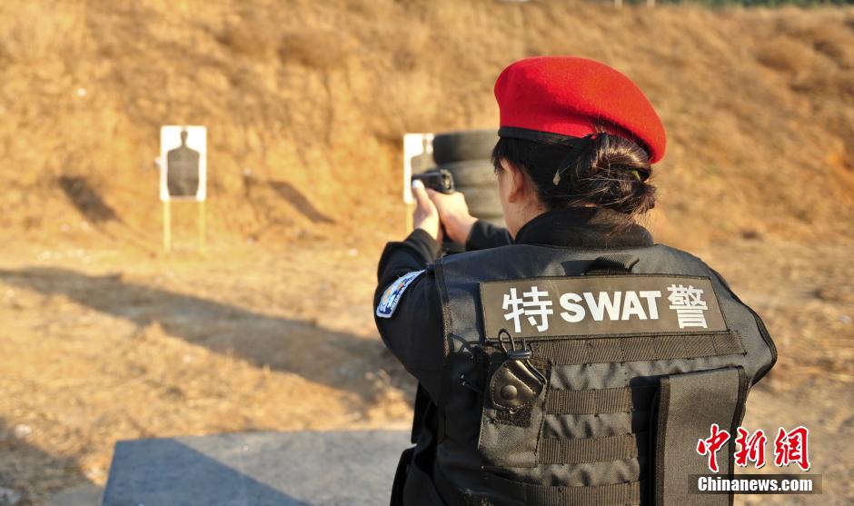 11月13日,女特警实弹射击。当日,在济南公安局特警支队“龙虎榜”比武竞赛上,女特警拆解枪械、排除卡弹故障、装弹拔枪速射一气呵成,枪枪弹无虚发。中新社发 张勇 摄