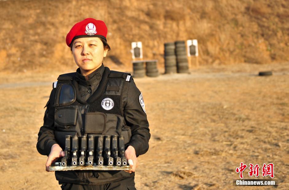 11月13日,女特警收枪入库。当日,在济南公安局特警支队“龙虎榜”比武竞赛上,女特警拆解枪械、排除卡弹故障、装弹拔枪速射一气呵成,枪枪弹无虚发。中新社发 张勇 摄