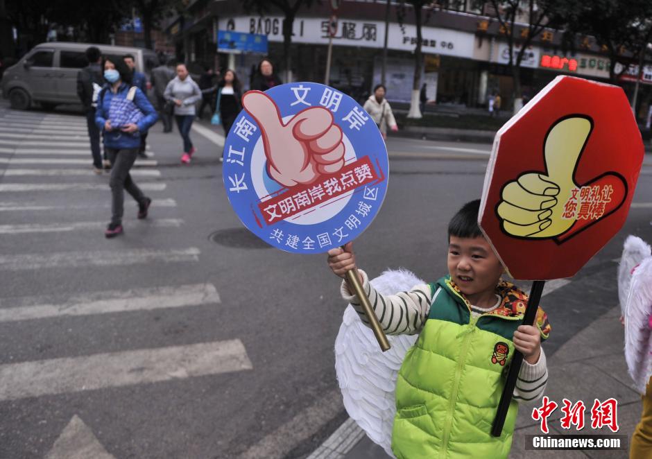 11月14日,重庆南岸区街头几位小朋友穿着一对白色的小翅膀,举着“文明点赞牌”站在马路旁,劝市民不能横穿马路,遵守交通规则,文明出行。 陈超 摄
