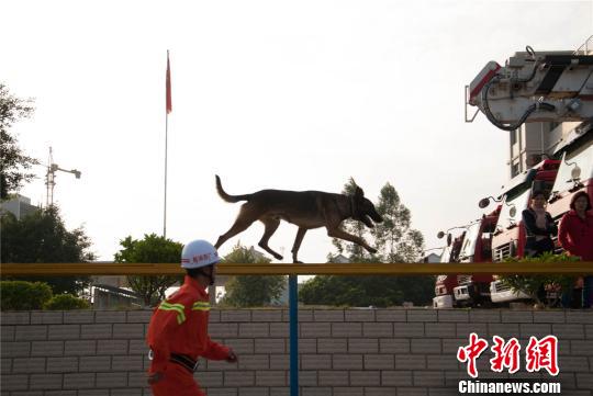 11月13日,广西柳州市公安消防支队新增的首批搜救犬进行消防救援演练。随行、服从、走单边桥、过梅花桩、钻钢圈,随着消防战士的口令,搜救犬迅速地执行各项指令。今年广西14个地市分别组建了搜救犬队伍,主要为史宾格犬、拉布拉多犬等犬种,可在地震、泥石流、塌方等灾害中快速搜救被困人员。