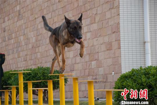 图为搜救犬正通过梅花桩障碍。 黄威铭 摄
