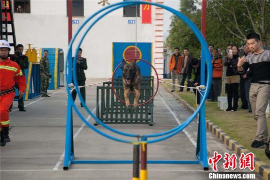 图为搜救犬正在钻钢圈。 黄威铭 摄