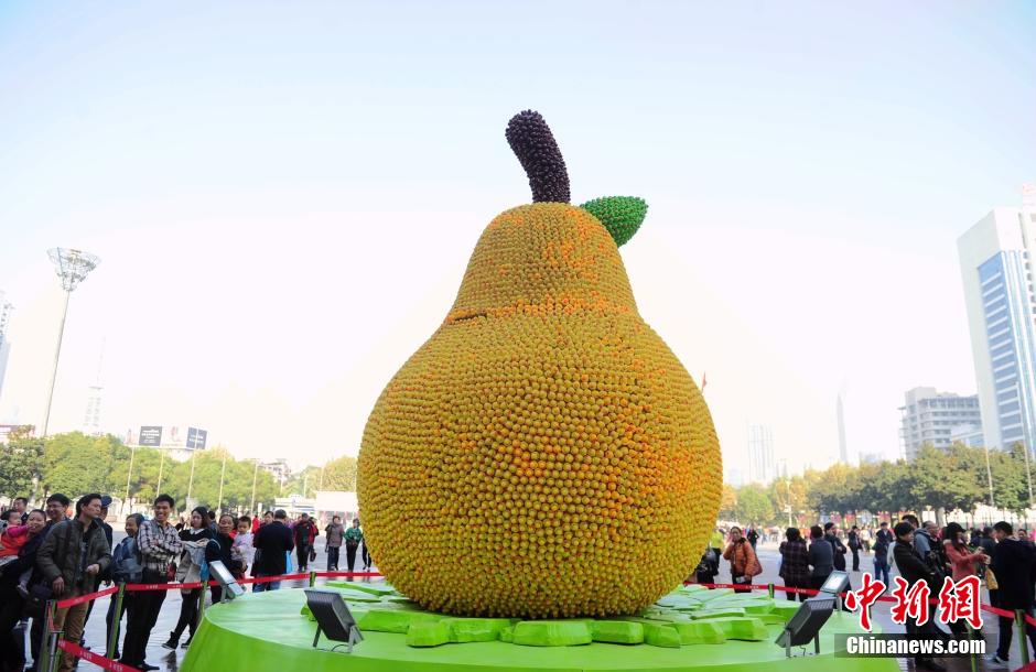 11月14日,在武汉国际会展门口摆放着一只高6米高巨大的“梨”。是由1.5万只小黄鸭集缀而成寓意“无鸭梨日”,为香港时尚购物展造势。主办方介绍,这叫“鸭梨山大”(压力山大),是一句很流行的时尚网络语言。这些嘟着嘴巴、翘着尾巴的小鸭子,是香港设计师许夏林的作品。他希望这些鸭子能给武汉市民带来欢乐,人人“无压力”。购物节还将展出30只特别版的B-duck,由香港艺人谢安琪、郑裕玲等设计,供市民拍照。 中新社发 张畅 摄