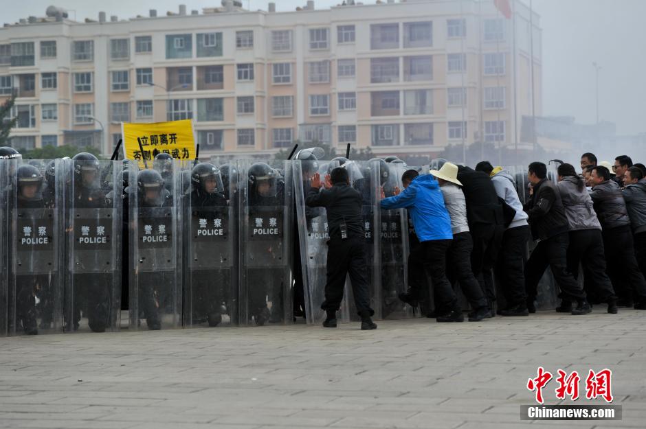 11月14日,云南省嵩明县举行反恐处突应急维稳综合演练。民警、消防、武警、协警等共600多名参训队员进行综合演练。演练主要为反恐格斗、应急处突、群体性事件处置战法等内容。图为反恐格斗演练。 中新社发 任东 摄