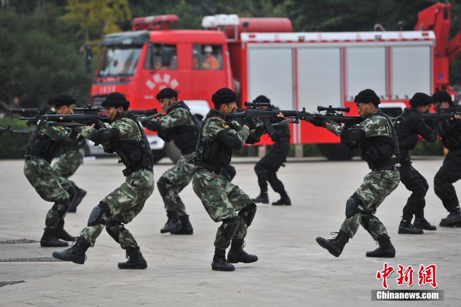 11月14日,云南省嵩明县举行反恐处突应急维稳综合演练。民警、消防、武警、协警等共600多名参训队员进行综合演练。演练主要为反恐格斗、应急处突、群体性事件处置战法等内容。图为反恐格斗演练。 中新社发 任东 摄
