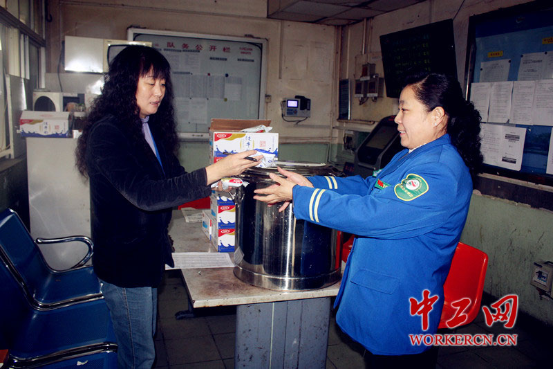 2014年11月1日清晨,客八基层车队干管们早早起来把牛奶加热好,放在保温桶里,当头班司乘人员刚到场站,就看到车队书记、工会主席、队长早已等候在了调度室,职工们一边接过车队领导递过来的热牛奶,一边高兴地说:“几年了,为了保证冬运,工会组织一直坚持为我们送温暖,干我们这行的早上上班太早,经常吃不上早点,能在上车前喝上热乎乎的牛奶,我们打心眼里感谢领导,感谢工会组织”。15日冬运的第一天,工会又将保暖护膝发放到近8000名职工手里。中工网记者 葛姗 摄