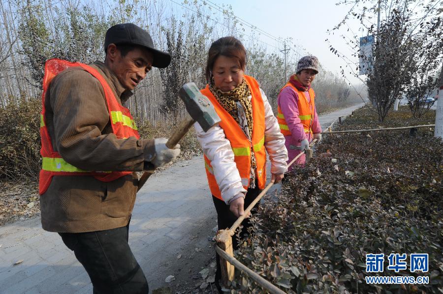 11月15日,园林部门工作人员在搭建支架,准备进行苫盖。连日来,河北省大厂回族自治县园林部门全面开展绿植冬季养护工作,为绿化带中耐寒性差的绿植穿上“冬装”,以抵御严寒、安全过冬。 新华社记者李晓果 摄