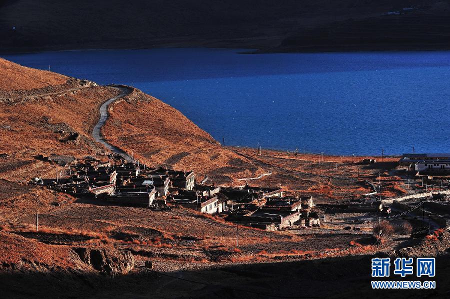 这是羊卓雍错日落景色(11月15日摄)。羊卓雍错简称羊湖,位于西藏山南地区浪卡子县境内,与纳木错、玛旁雍错并称西藏三大圣湖。日落时分的羊卓雍错如诗如梦,让人流连忘返。新华社记者 刘坤摄