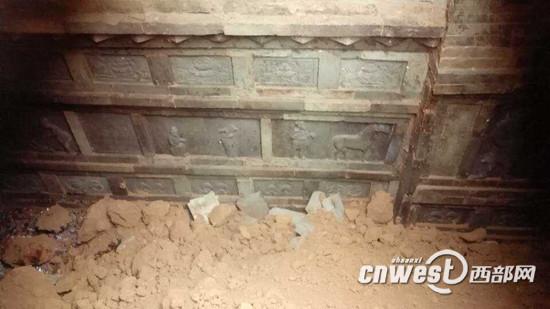 “又挖出来个墓,里面雕刻的东西挺精美的。”11月16日上午,宝鸡一网友发微博说,宝鸡一施工工地发现了一古代墓葬,墓葬里的雕刻很精美。在该网友配发的一组图片中,记者看到,墓室的砖雕上有人物和马匹的图案。