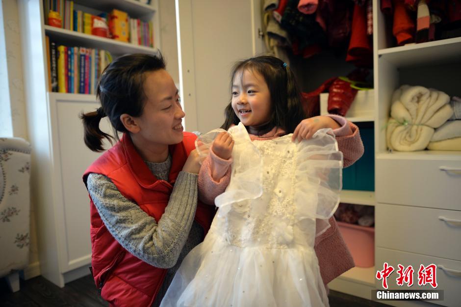 重庆渝北区冉家坝龙湖大城小院,记者在郭知画的卧室看到,连衣裙、外套、羽绒服、风衣布满衣橱,DIY化妆盒、手工小帐篷充塞房间,俨然一个公主房。这些全都是妈妈王怡亲手设计,亲手制作。“画画喜欢这些可爱的东西,我也希望她能过得开心,就给她做了。虽然要花费很多时间,但我觉得值。”王怡说,选布料、画图设计、缝纫、熨烫,一件衣服要经过一道道繁复的工序。2012年冬天做第一件衣服时,她还是个连缝纫机都不会用的新手,到现在已经为女儿设计制作出上百件衣服。32岁的王怡告诉记者,她大学读的法律,做衣服没有任何基础。2012年女儿两岁,开始爱臭美,王怡本人也觉得外面买的衣服不是很好看,便动了自己动手的念头。 “因为之前没学过,怕家人反对,就偷偷在网上买了一台缝纫机。”王怡说,缝纫机买回来后,她连怎么用都不知道。丈夫一开始就反对,觉得她根本做不好。缝纫机送到家里是圣诞节前夕,为了能让女儿在圣诞节穿上她亲手做的衣服,王怡开始着手学习:看缝纫机说明书,看网上视频教程,哪类衣服用什么样的线、什么样的针……“白天要带女儿,只能晚上学。”王怡说,熟悉机器、摸清整个制作流程她花了整整三个通宵,后来称体重时发现自己瘦了6斤。中新社发 渝友 摄