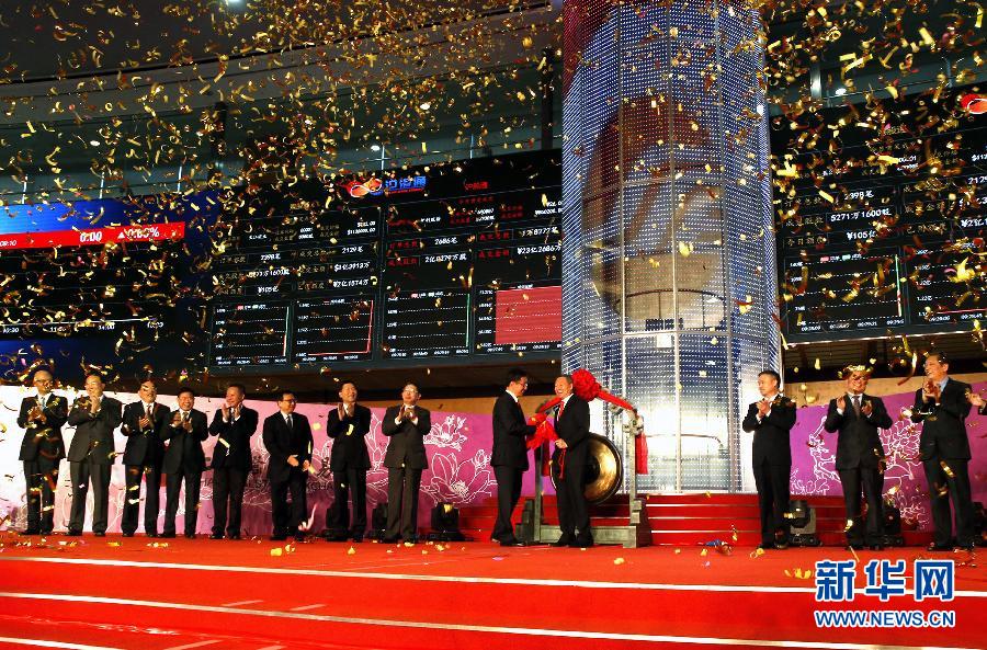 11月17日上午9时30分许,中共中央政治局委员、上海市委书记韩正(右五),中国证监会主席肖钢(右四)共同为上海证券交易所当日交易鸣锣开市,标志着作为资本市场重大制度创新的沪港通正式启动,沪港两地证券市场成功实现联通。新华社记者 陈飞 摄
