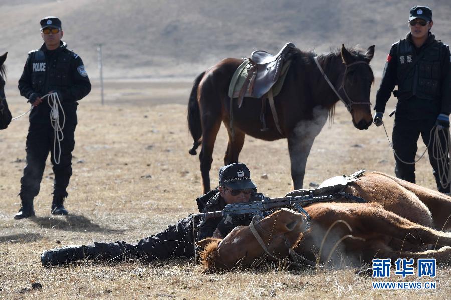 在玛曲县齐哈玛乡草原,玛曲县公安局草原骑警大队队员在训练人马协作(11月16日摄)。