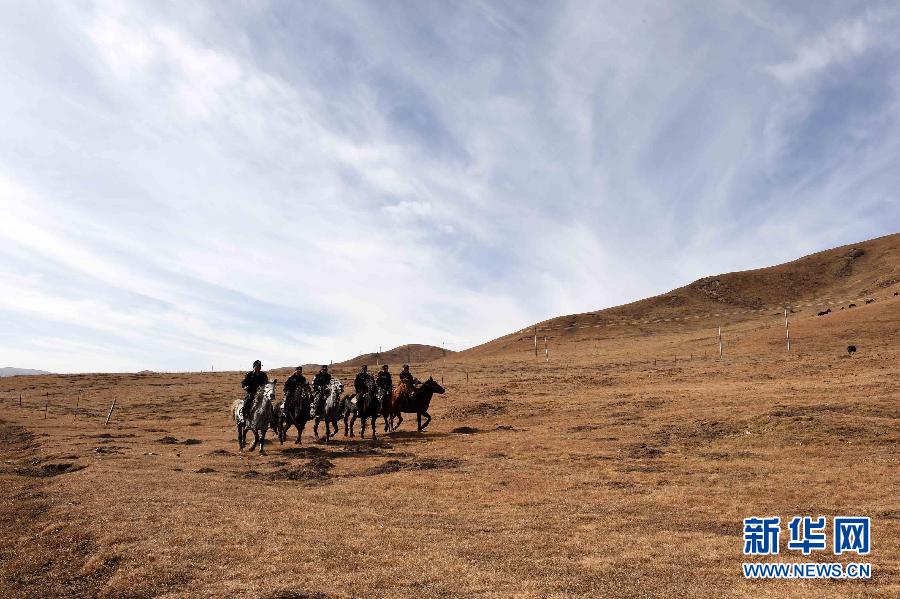 在玛曲县齐哈玛乡草原,玛曲县公安局草原骑警大队队员在巡逻(11月16日摄)。新华社记者 周华 摄