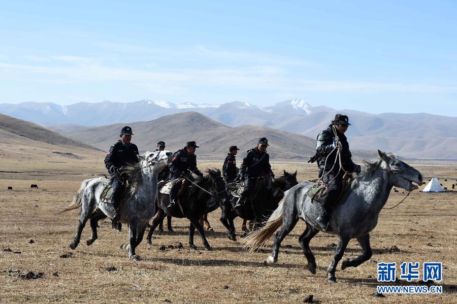 在玛曲县齐哈玛乡草原,玛曲县公安局草原骑警大队队员在巡逻(11月16日摄)。新华社记者 周华 摄