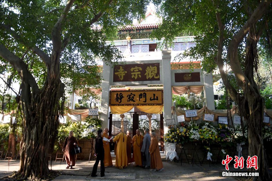 11月21日,香港佛教联合会会长觉光长老圆寂舍报,“觉光长老圆寂追思赞颂仪典”在香港观宗寺举行,行政长官梁振英、中联办主任张晓明、国家宗教事务局副局长蒋坚永等亲临吊唁。中新社发 张宇 摄