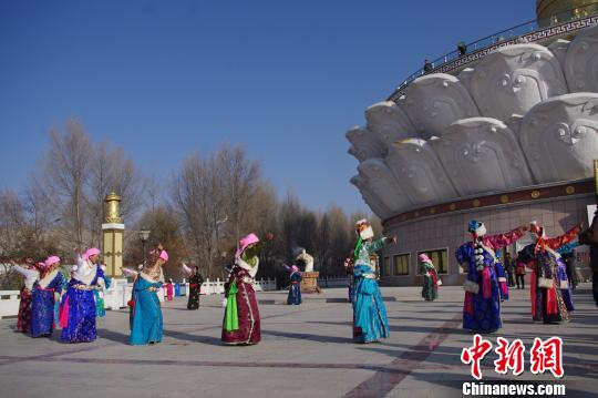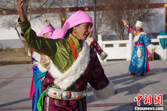 11月21日,青海海南藏族自治州贵德县河西镇下排村的20余位妇女,在拥有世界最大转经筒的中华福运轮广场舞起了非物质文化遗产尚尤则柔。尚尤则柔种类繁多,内容以对家乡、自然风光等的歌颂为主,并广泛反映群众生活的各个方面,它不但表现出强烈的自娱性,而且具有非常浓厚的庆典性、仪式性和超高的表演性。下排村57岁的藏族妇女叶西卓玛介绍,下排村村落建成的时候,就已经有尚尤则柔了,“我们在家里有喜事的时候,就会边唱边跳,意在祈求家庭幸福、吉祥如意。”