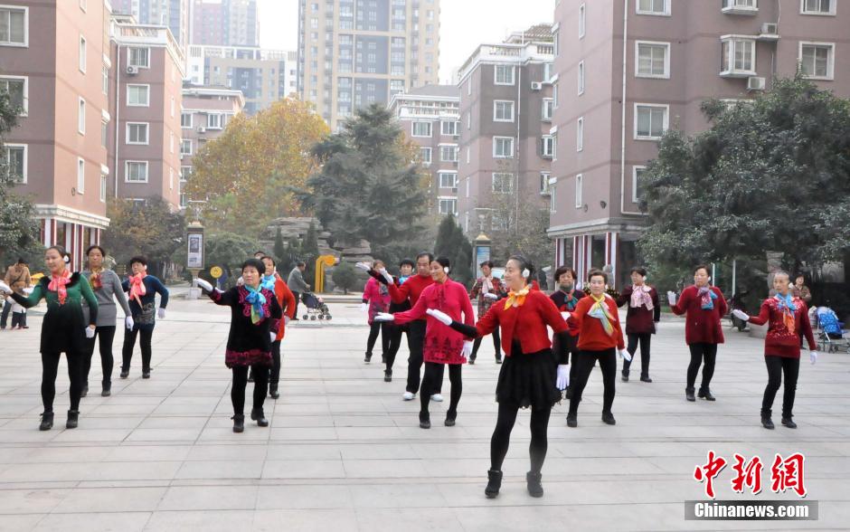 11月20日,河南郑州街头,广场舞参与者戴着无线耳机享受音乐节奏锻炼身体。近日,媒体连续报道了广场舞噪音扰民引发的纷争不断,引发社会各界的广泛关注,现场的过往民众表示,戴着耳机跳广场舞,既起到了锻炼身体的作用又保证不会出现噪声扰民。中新社发 王中举 摄