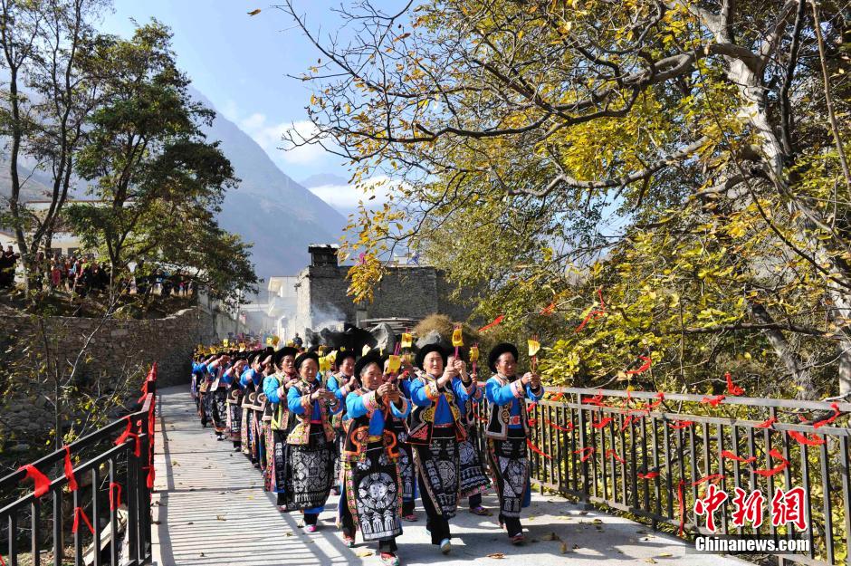 11月21日,四川理县羌族民众在羌族传统节日“羌年”即将到来之际举行羌族祭祀仪式庆丰收迎新年。中新社发 安源 摄