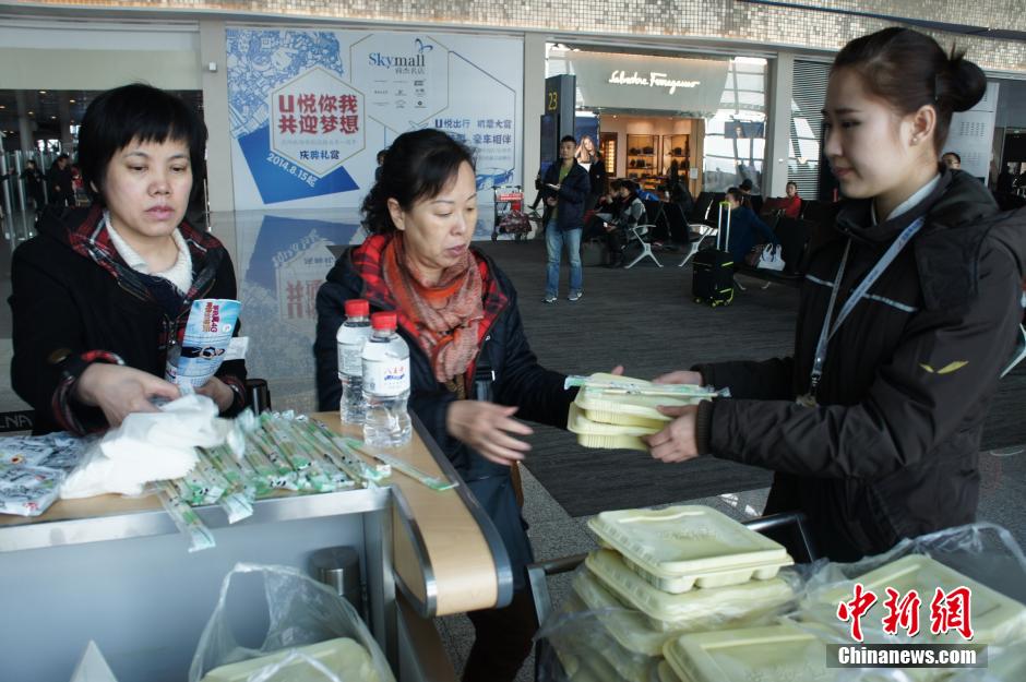 11月21日,辽宁境内多地遭遇能见度小于50米的强浓雾天气,降雾导致多条高速公路封闭、机场航班延误,沈阳桃仙机场一度滞留旅客逾2400人。图为沈阳机场工作人员为滞留旅客发放餐食。中新社发 李依枚 摄