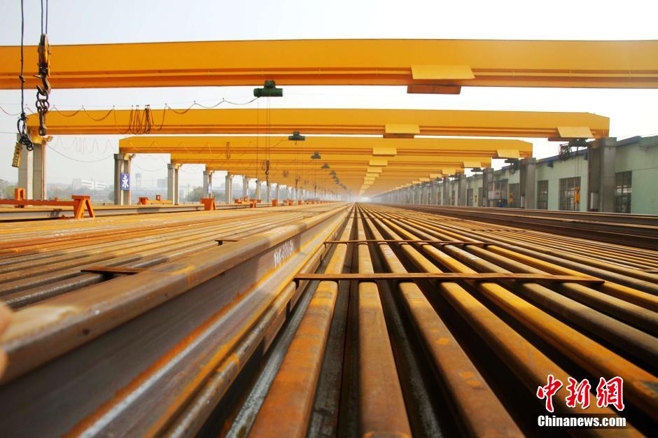 500米长的钢轨每根重达30吨,正在吊装的钢轨,由于太长看上去犹如柔软的“面条”。 张卫东 摄