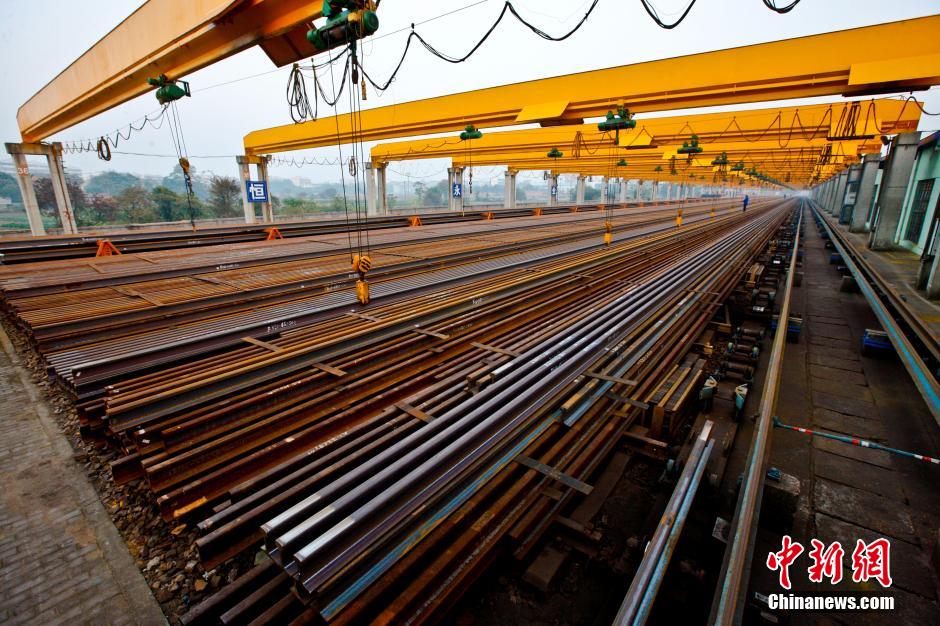 500米长的钢轨每根重达30吨,正在吊装的钢轨,由于太长看上去犹如柔软的“面条”。 张卫东 摄