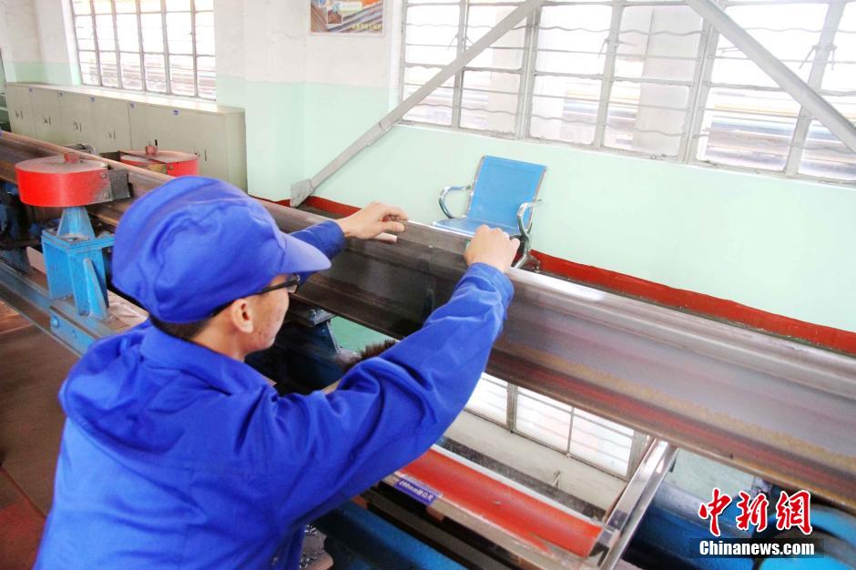 图为工作人员正在为焊接后的钢轨做外观平直度精矫直测量。 蔡栩 摄
