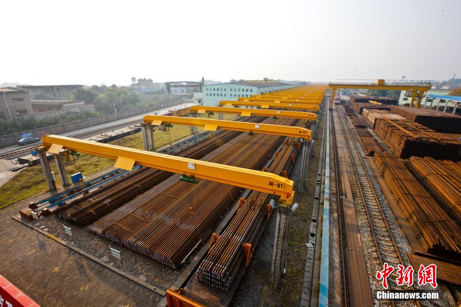鹰潭工务机械段向塘焊轨车间成品轨场上百根焊接完成的钢轨整齐堆放,36台黄色的龙门吊成列排开,场面雄壮气势恢宏。 张卫东 摄