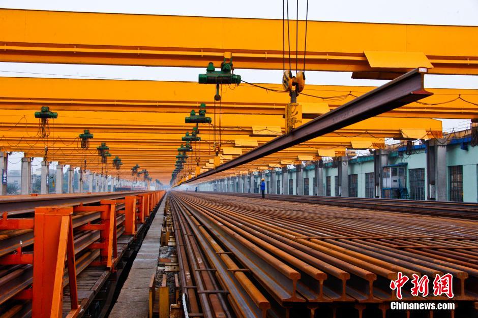 鹰潭工务机械段向塘焊轨车间成品轨场上百根焊接完成的钢轨整齐堆放,上方36台黄色的龙门吊成列排开,场面雄壮气势恢宏。图为工人正在吊运钢轨准备装车。 张卫东 摄