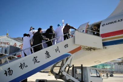 在到达康定机场后,机场方和医生们就吴茂清从救护车上运送到飞机上的方案进行了沟通,为了保障病人的安全,最终决定用救护推车将他运送到舷梯旁后,用消防专用铲式担架,人力将他搬运上去。