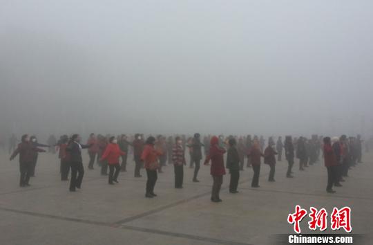 图为榆中县民众在雾中跳广场舞。赵江梅 摄
