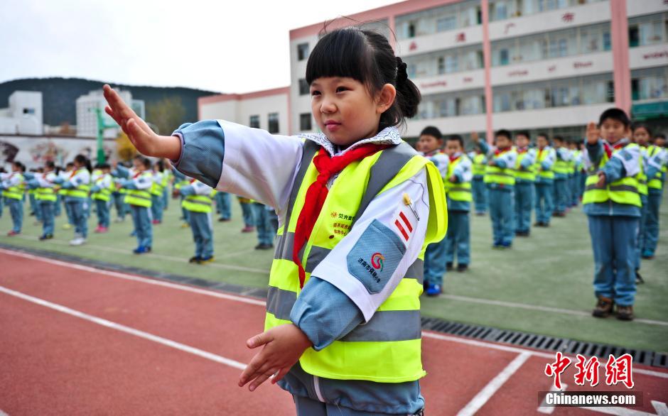 11月25日,小学生课间做“小交警韵律操”锻炼身体。当日,济南舜耕小学700余名小学生身着荧光衣,在课间做以交通警察指挥手势编排成的“小交警韵律操”,健身的同时熟知交通安全法规。中新社发 张勇 摄