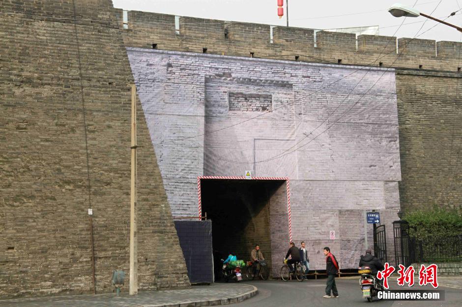 近日,位于西安东城墙中段的小东门进行维修保养,以往维修保护工程的绿色防护网被“立体式围挡”所代替,引路人侧目。小东门是西安城墙一城门,又名中山门,于1926年初开此门,以纪念国民革命领袖孙中山而得名。张一辰 摄