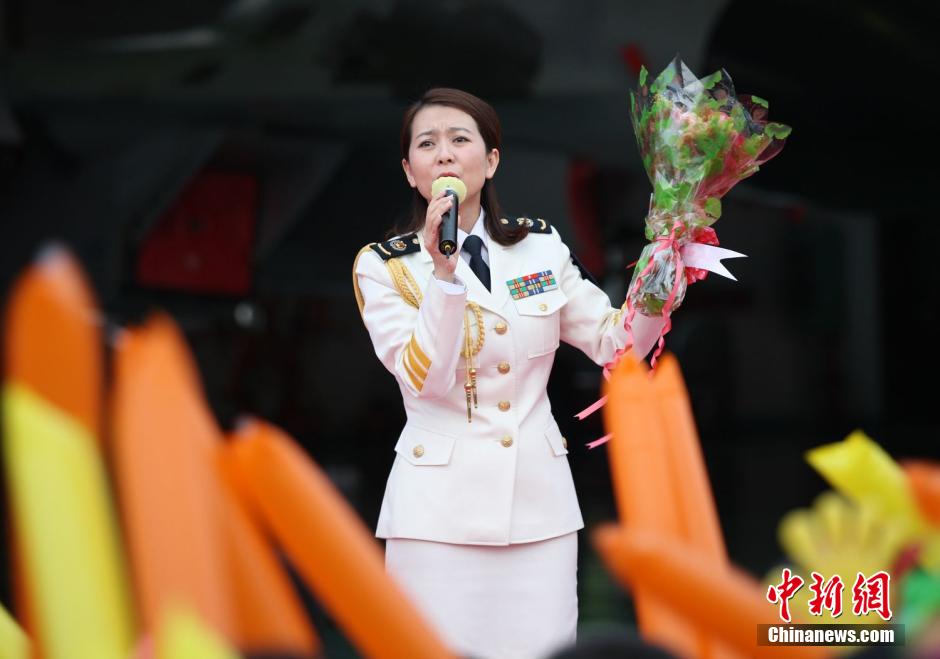 中国海政文工团宋祖英、霍勇、甘萍、常思思等27名演职人员组成的文艺小分队,近日来到南海舰队航空兵驻琼4个单位慰问演出。他们以专业的唱功、优美的歌喉为官兵们带来了一场视听艺术盛宴。图为甘苹在演唱。 中新社发 高宏伟 摄