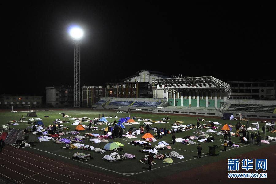 11月26日凌晨,人们在康定县北门体育场内避险。北京时间11月25日23时19分,四川省甘孜藏族自治州康定县(北纬30.2度,东经101.7度)再次发生地震,震级为5.8级,震源深度约16公里。11月22日,康定县发生6.3级地震。 新华社发(夏俊林 摄)