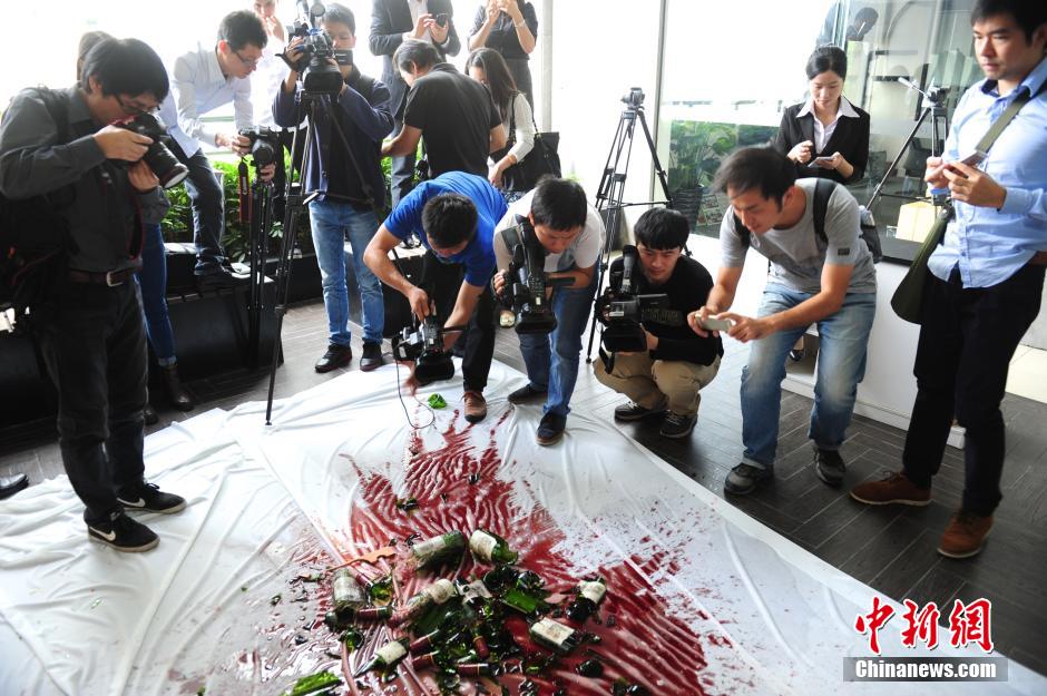 11月24日,深圳某酒业公司员工在办公区怒砸假“拉菲”酒,不让假拉菲流入市场。该公司于2012年5月21日通过拍卖公司拍得13069瓶红酒,总价值700余万元人民币,其中法国“拉菲”红酒346瓶。后经相关部门鉴定,227瓶为假“拉菲”。图为媒体记者在砸酒现场采访。中新社发 陈文 摄