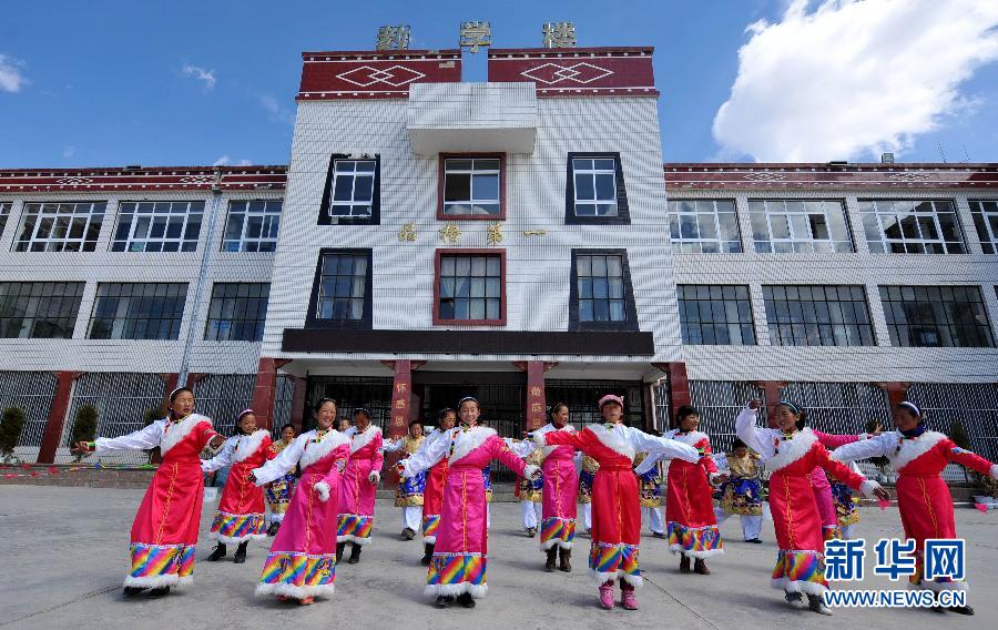 云南省迪庆藏族自治州香格里拉县建塘镇纳赤塘小学的一些藏族小学生在新建成的教学楼外跳民族舞蹈(3月11日摄)。