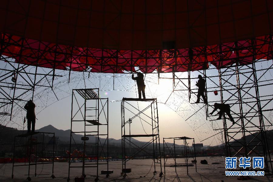 11月25日,在河北省承德市双滦区鼎盛皇家广场,工人在焊接灯会主体舞台。近日,位于河北省承德市双滦区的第二届鼎盛皇家灯会正在筹备中。鼎盛皇家灯会占地面积18万平方米,将制作彩灯2000多盏,有600余人演出阵容,100余个演出节目,将于12月24日华丽登场。灯会将突出体现承德地区的皇家文化、民俗文化、冰雪文化、美食文化和动漫文化等。 新华社发(王立群 摄)