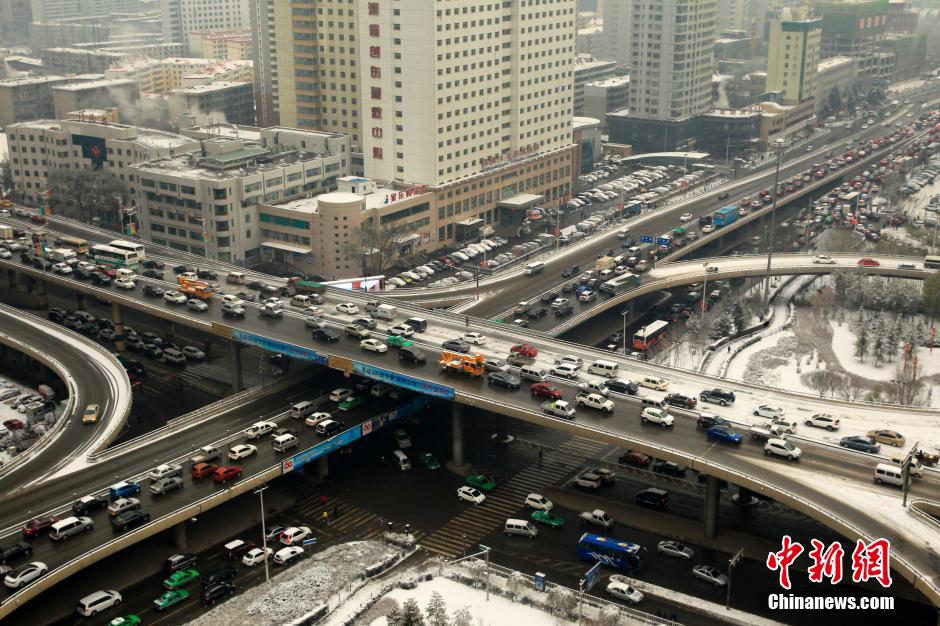 11月24日上午,受降雪天气影响,青海省会西宁市区多条道路结冰后变成了露天“停车场”,市区民众因道路拥堵出行受阻。 中新社发 胡贵龙 摄