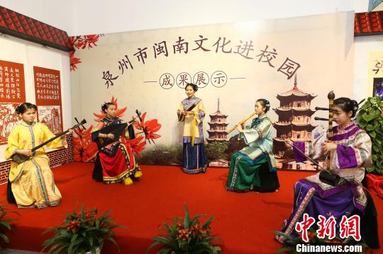 11月26日,“东亚文化之都·泉州”学生文化创意作品展在泉州西街展出。泉州学生现场展示南音演奏、永春纸织画制作、编藤铁等,吸引广大市民前来观赏。(李南轩 摄)