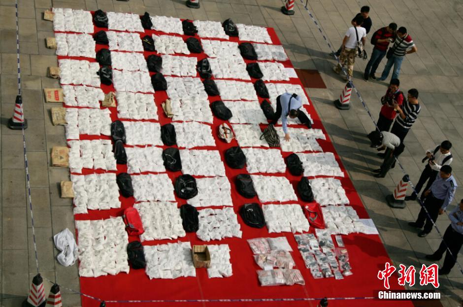 11月26日,广东省公安厅披露,自9月29日公安部部署开展“百城禁毒会战”以来,广东警方共侦破毒品案件3800多宗,抓获犯罪嫌疑人4400多名,打掉制毒场点40多个,缴获各类毒品约6.5吨,查处吸毒人员2.2万人次。图为警方展示扫毒战果。中新社发 唐乃国 摄