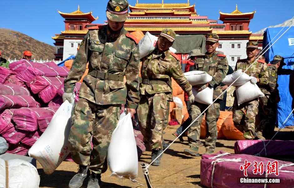11月26日,甘孜森警帮助抢运救灾物资。当日,为确保救灾物资尽快发放到受灾民众手中,武警甘孜州森林支队派出48名官兵协助地方政府发放和装运救灾物资。中新社发 曾鹏 摄