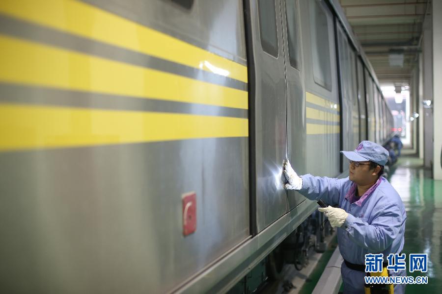 11月26日,工作人员在北京地铁7号线焦化厂车辆段调试车辆。目前,北京城区南部东西向骨干交通线地铁7号线已全面进入综合调试阶段,预计将于2014年年底开通。地铁7号线工程位于北京城区南部,线路全长23.7公里,全部为地下线,共设21座车站,西起北京西站,东至焦化厂站。新华社发