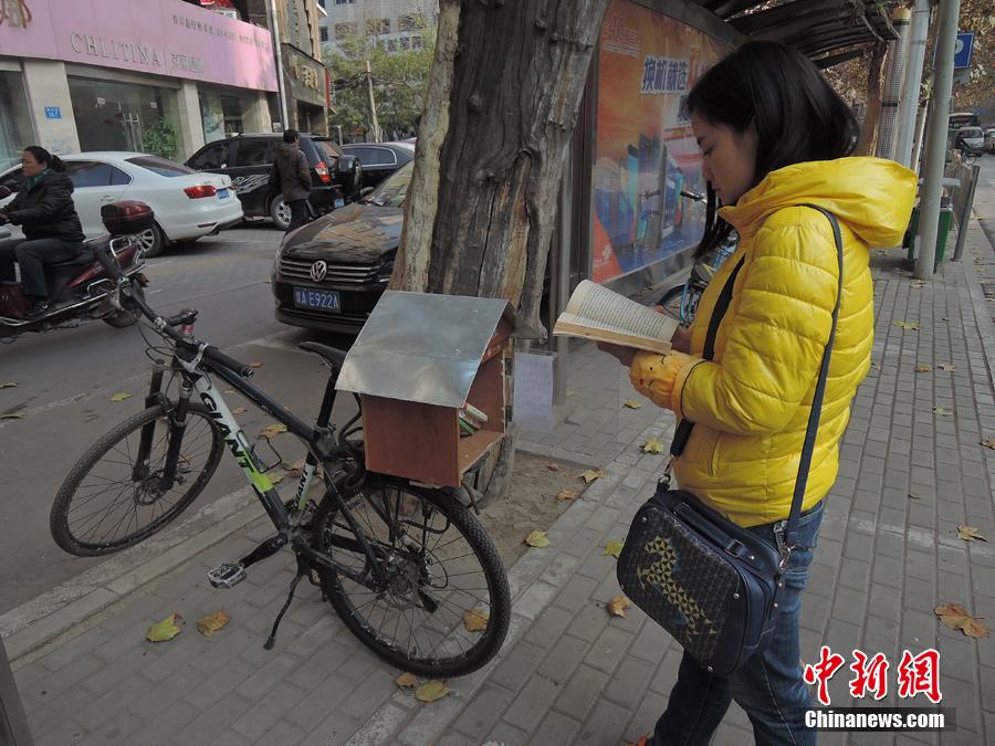 近日,郑州街头一个“鸟巢书屋”低调安身自行车上,每日在公交站牌为市民提供阅读机会,受到不少市民的亲睐。“鸟巢书屋”的制造者闫德峰,每天早上把自行车停在公交站牌,晚上再推回家,他希望人们能在匆忙的行程中在书屋前驻足片刻。“鸟巢书屋”是一种具有公益性质的图书馆,人们可以在其中分享自己喜爱的图书。在使用鸟巢图书馆的同时,必须自觉遵守“取走一本书,放入一本书”的原则,目的在于让人们在书籍的交换中享受自由的阅读。图为图为一位等车的女青年在翻看书屋里的书籍,她感慨能在街头读到陌生人提供的书籍内心很温暖。 韩章云 摄