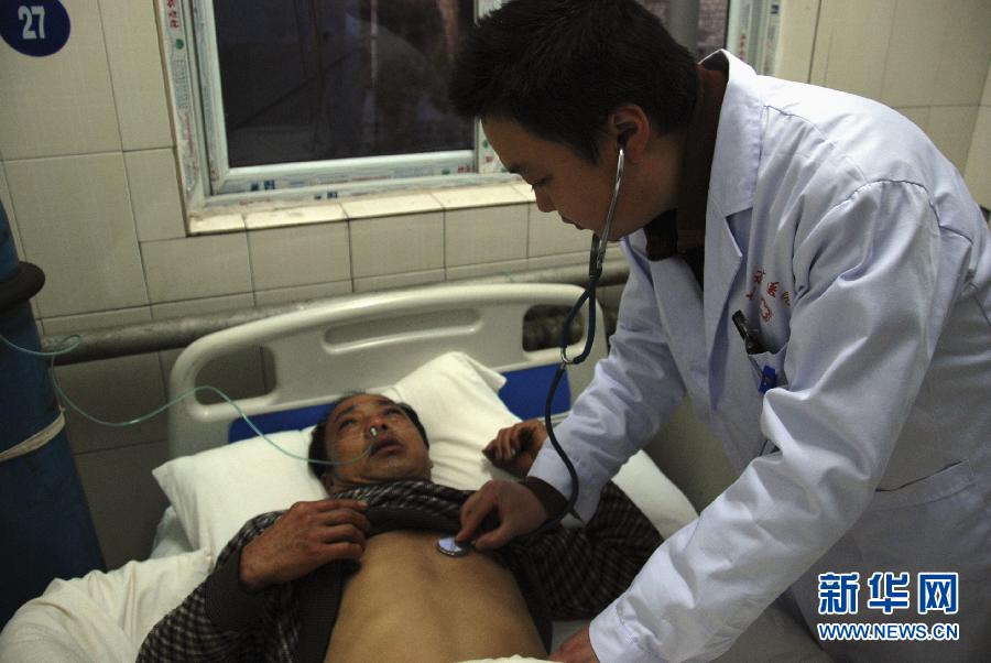 11月27日,盘江精煤公司土城矿医院医生在为一名伤员检查身体。当日5时45分,贵州省盘县松河乡松林煤矿发生一起瓦斯爆炸事故。截至目前,事故已造成11人死亡。目前,现场救援和善后等工作正在紧张进行,事故原因正在进一步调查中。新华社发(刘佳跃 摄)