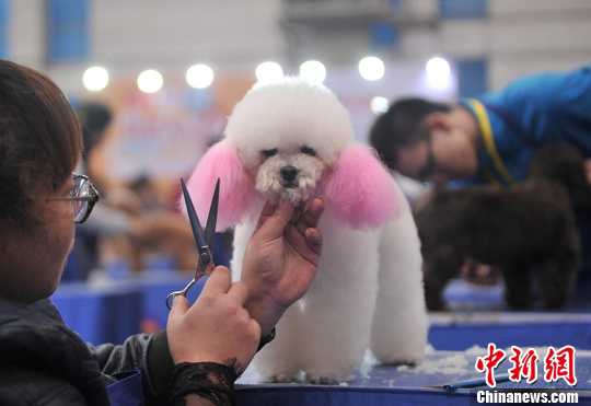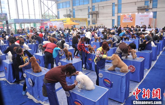 11月28日,重庆爱宠节在陈家坪会展中心开幕,宠物美容师正在进行创意美容大赛,为宠物们打扮比美。