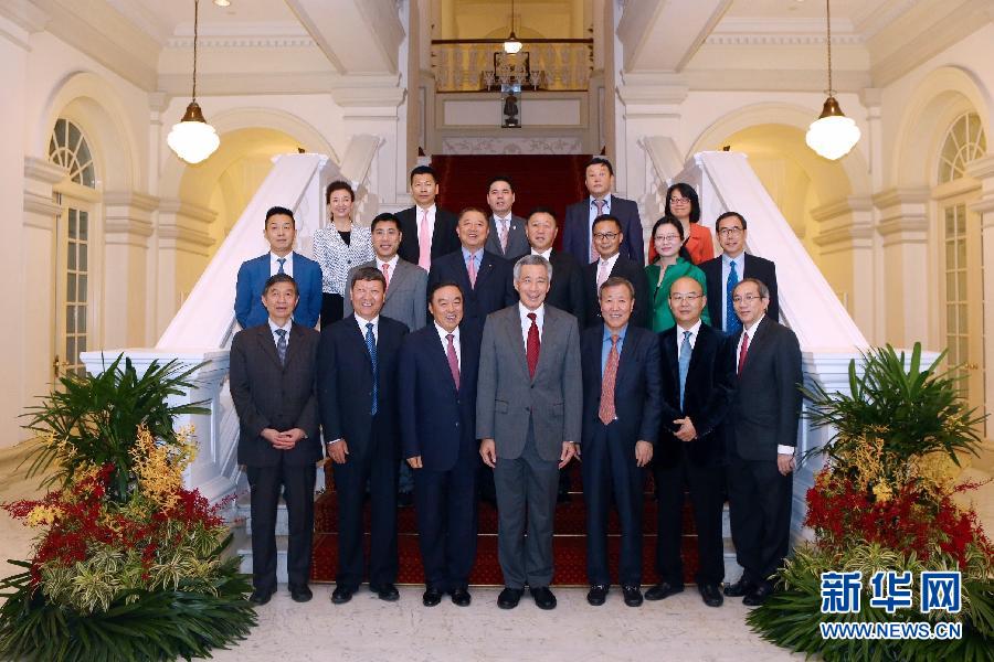 11月28日,新加坡总理李显龙(前排中)和到访的中国企业家俱乐部代表团合影。 中国企业家俱乐部代表团于11月28日至30日访问新加坡。新华社发(崔宇摄)