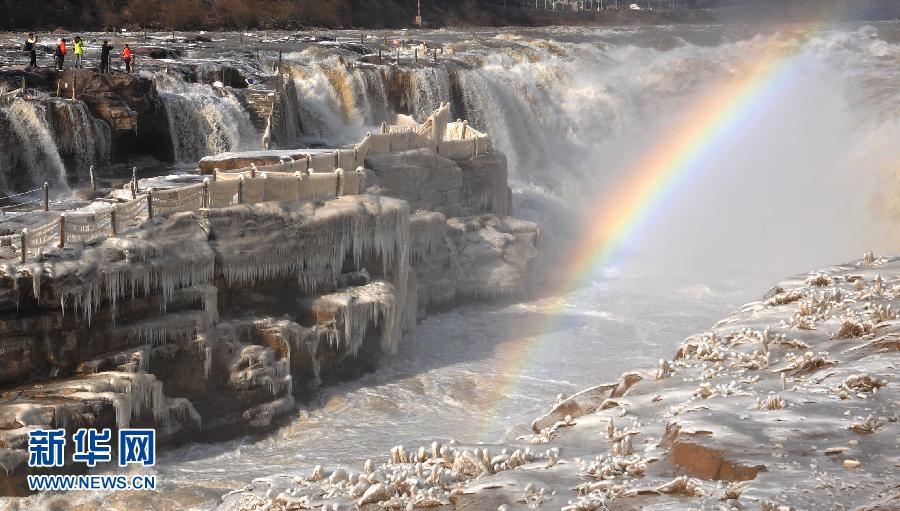 12月6日,游客在山西吉县欣赏出现冰挂的黄河壶口瀑布。