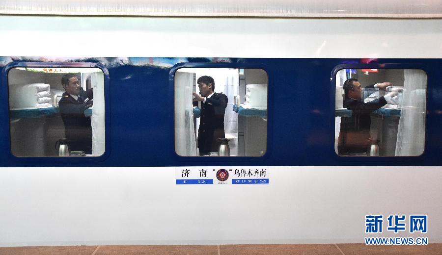 12月9日,Z4005/6次列车的乘务员在火车发车前检查、整理硬卧车厢内的设施。当日21时58分,首趟往返于济南与乌鲁木齐间的直达特快列车Z4005/6次列车从山东济南火车站发车,该车运行时间为40小时01分,比原来两城市之间火车的运行时间缩短了8小时35分。新华社记者 徐速绘 摄