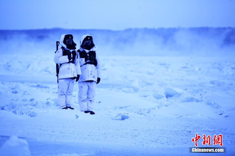 2014年12月10日,“黑河好八连”哨兵辛国强和张波冒着零下32度高寒气温在中俄界江黑龙江上为祖国母亲站岗。中新社发 魏建顺 摄 图片来源:CNSPHOTO