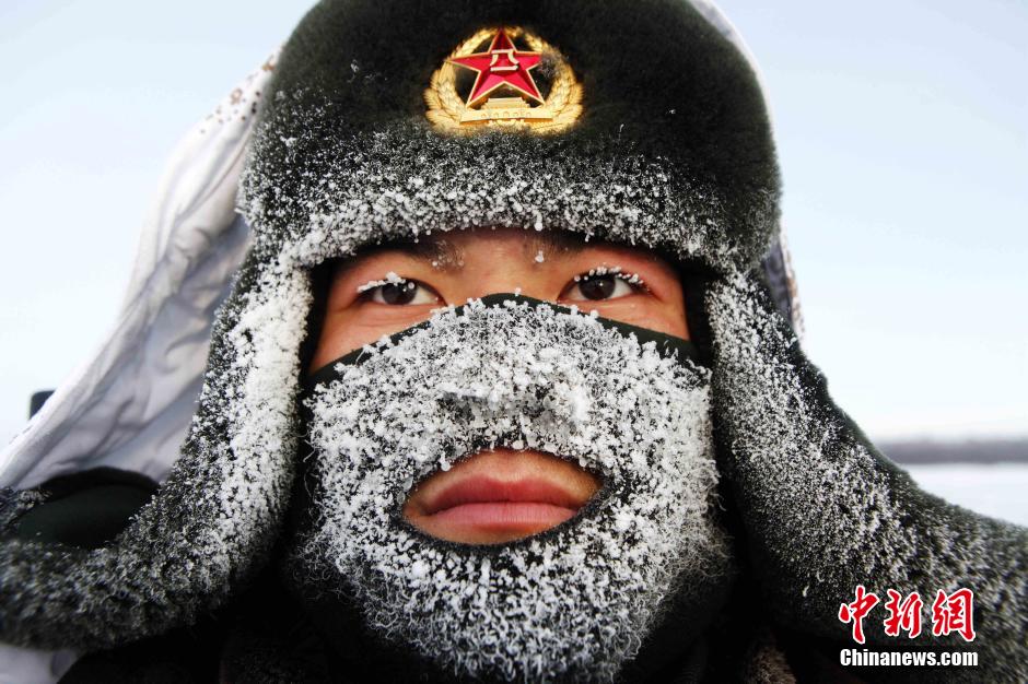 2014年12月10日,“黑河好八连”哨兵辛国强冒着零下32度高寒气温在中俄界江黑龙江上为祖国母亲站岗。中新社发 魏建顺 摄 图片来源:CNSPHOTO